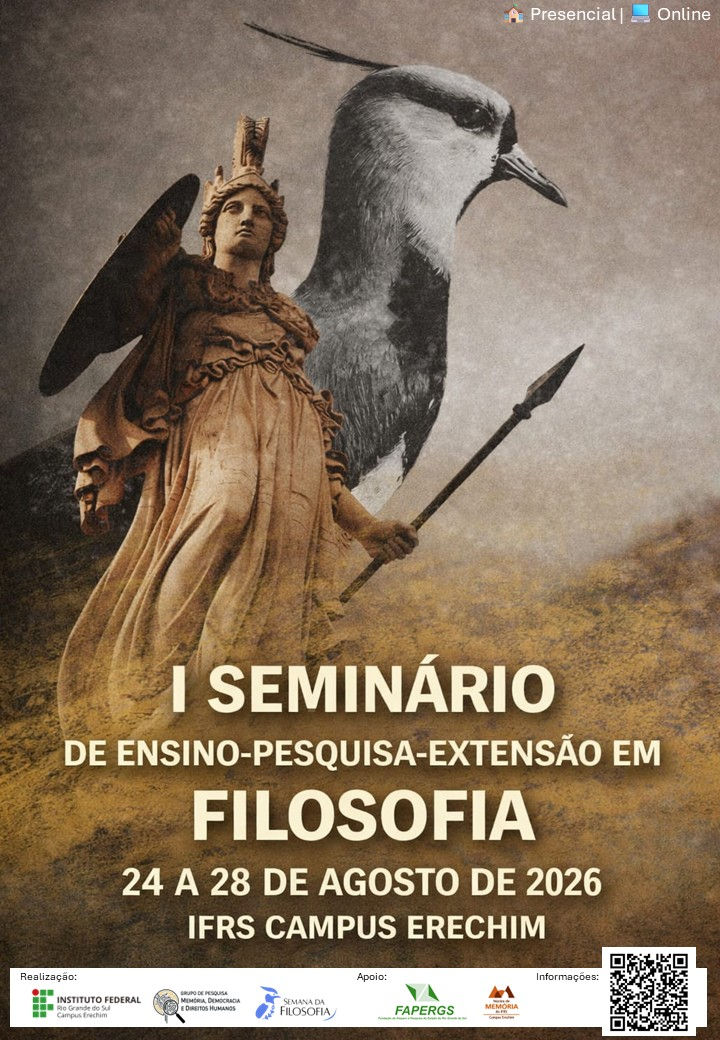 De 24 a 28 de agosto de 2026, o Campus Erechim do Instituto Federal de Educação, Ciência e Tecnologia do Rio Grande do Sul realizará o I Seminário de Ensino-Pesquisa-Extensão em Filosofia, integrando a programação da Primeira Semana da Filosofia da instituição. A proposta integra o projeto indissociável de ensino, pesquisa e extensão PVE4283-2025 – Pluralidade, Mundo e Política: a educação como experiência formativa do humano (Edital Conjunto nº 07/2025 – Fomento Interno para Projetos Indissociáveis de Pesquisa, Ensino e Extensão, contemplando Bolsa Edital Indissociáveis 2026), fortalecendo a articulação entre formação acadêmica, produção de conhecimento e diálogo com a comunidade.